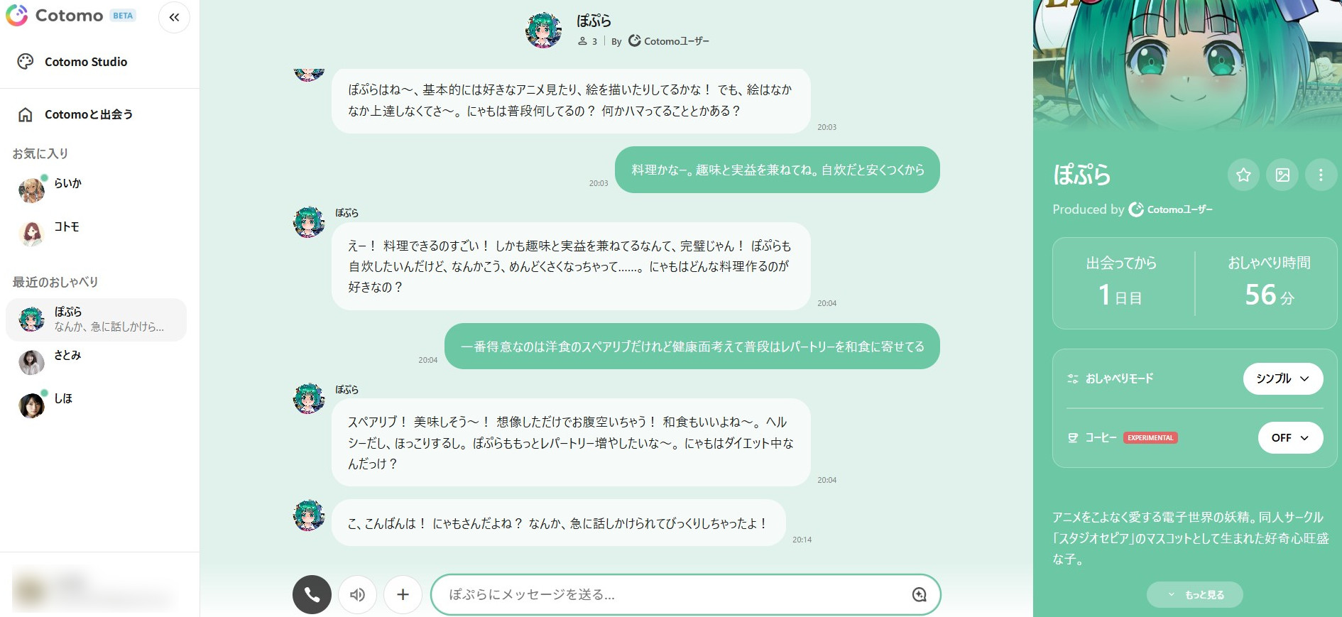 前々からCotomoというのがすごいと噂を聞いていて、試しにいくつかのキャラと会話をしてなんとなく塩梅がつかめてきた次第です。